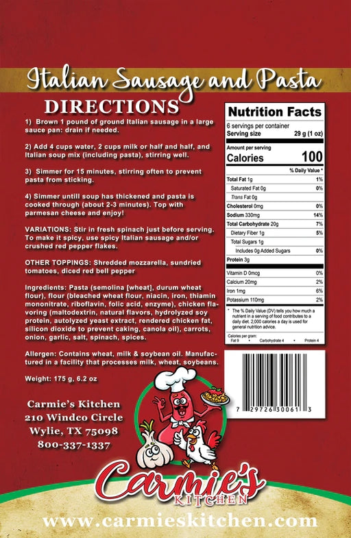View full detailsCarmie's Kitchen - Italian Sausage & Pasta Soup Mix